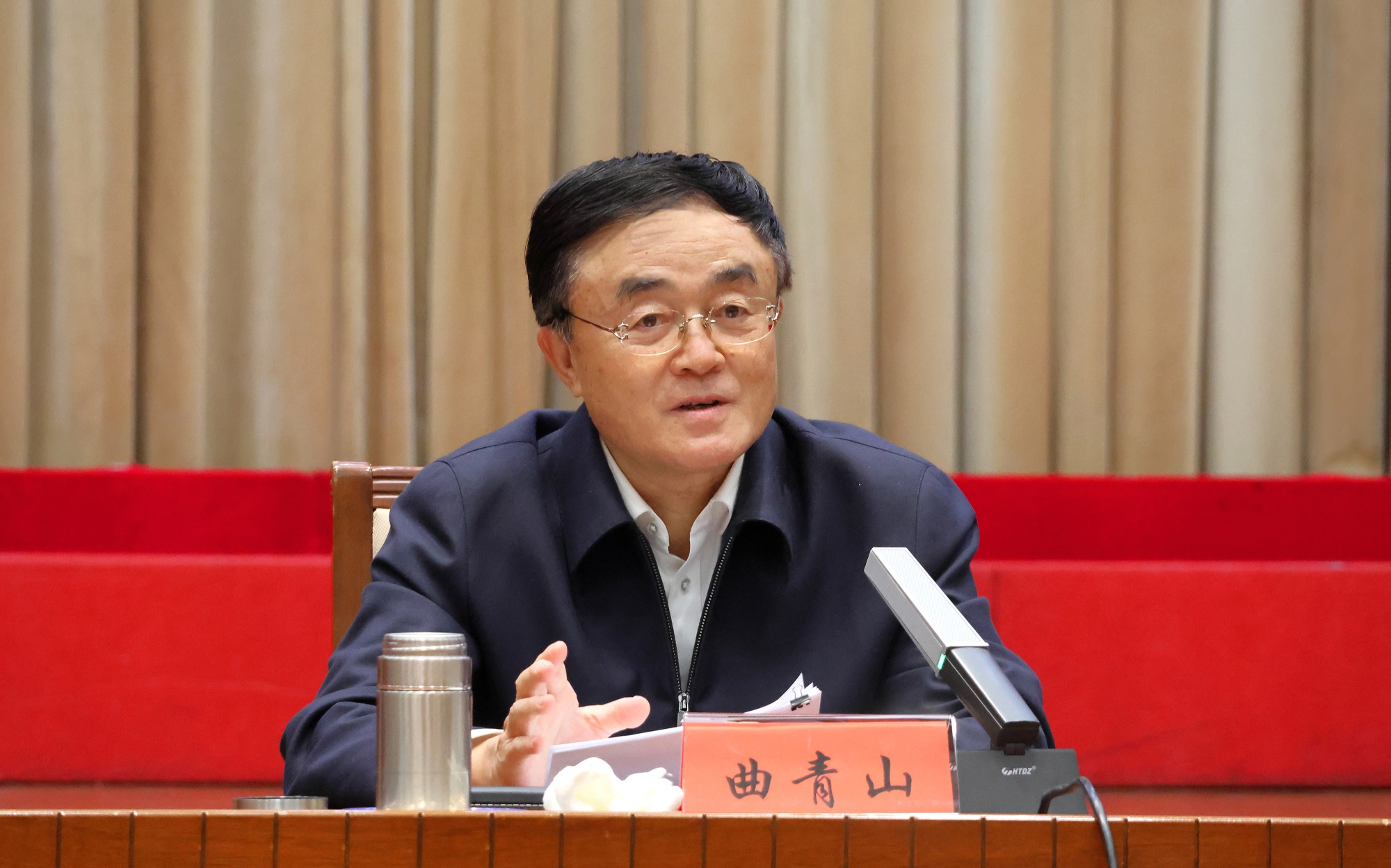 曲青山在听取5名新入职干部代表发言后,以“立志做党史和文献工作光荣传统和优良作风的忠实传人”为题,从“爱党护党、实干担当、严于律己”三个方面,对青年同志如何接好党史和文献工作的接力棒提出具体要求和殷切期望。