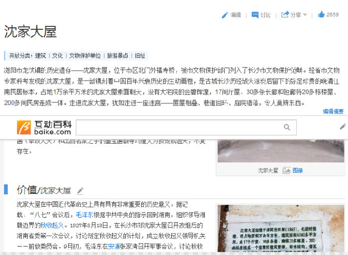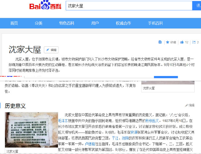 按照一些媒体的报道,或是在网上搜索“沈家大屋”词条,就算是赫赫有名的百度百科、互动百科等都会告诉你:沈家大屋在浏阳龙伏镇(见下图)。但事实上,此沈家大屋非彼沈家大屋,策划秋收起义的沈家大屋原址应在今日长沙市开福区芙蓉中路附近。